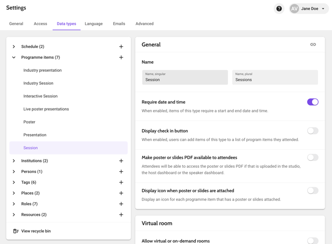 The data types can be used to categorise and structure your data. For every type that is available, you can set different options for what is displayed in the app and what is available for attendees. Some examples:
