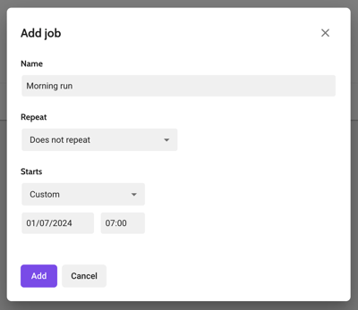 Click Add job and select the date and time of the (first) occurrence. Please note that jobs are scheduled in the CET timezone, so take this into account when selecting a time.