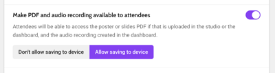 You can now choose whether you want to allow attendees to download or share the poster/slides linked to a programme item in the mobile app. You can find the setting in the data types. Select a programme item type and make sure that the toggle for Make PDF and audio recording available to attendees is on. Then choose the preferred option. In the mobile app, a Download icon is available when Allow saving to device is on.When it's off, the button is not there