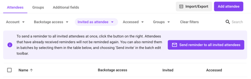 - Besides batch-inviting users, you can now also batch-remind them about your event. In the attendees table, filter on Invited as attendee and then click Send reminder to all invited attendees. Please note that attendees who have already received a reminder, are filtered out and will not receive another one.