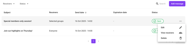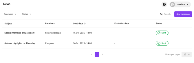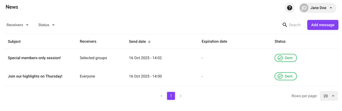 Targeted messages to groups and general news messages to your entire community or all attendees of an event, can now be found in the same table. The table is sorted by send date, and you can filter the messages based on the receivers (All or Selected groups) and on the status (Sent or Scheduled).