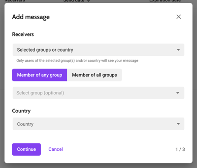 Choose who should see your message. For app messages, Everyone means all community members. For event messages, it means all users that have access to the event. When choosing Selected groups, you can choose one or multiple groups, and choose whether the receivers should be a member of all groups (for example Members AND Students) or one of the groups (for example Members OR Students). You can also select a country to send the message only to attendees that have this country set in their profile. Click Continue for the next step.