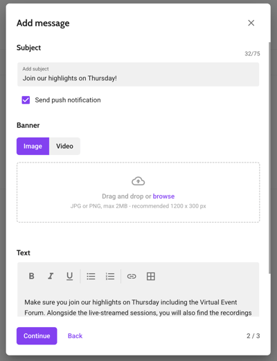 Add the message subject, choose whether you want to send a push notification, and add the body text. Simple markup is allowed. Optionally, add an image or video link to the message. Videos must be hosted on Vimeo or YouTube. Click Continue for the final step.