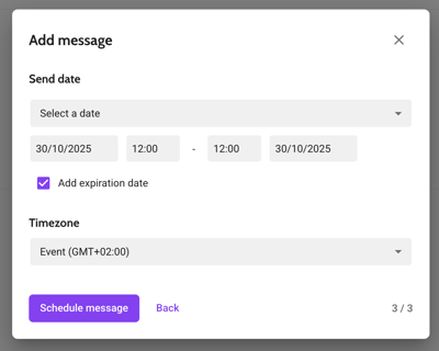Select whether you want to send the message right away, or schedule a date in the future. Optionally, you can add an expiration date. The message will disappear from the feed after this expiration date. This can for example be handy for messages about sessions, that are no longer relevant after the session has ended. Then to send or schedule the message, click Send message or Schedule message.