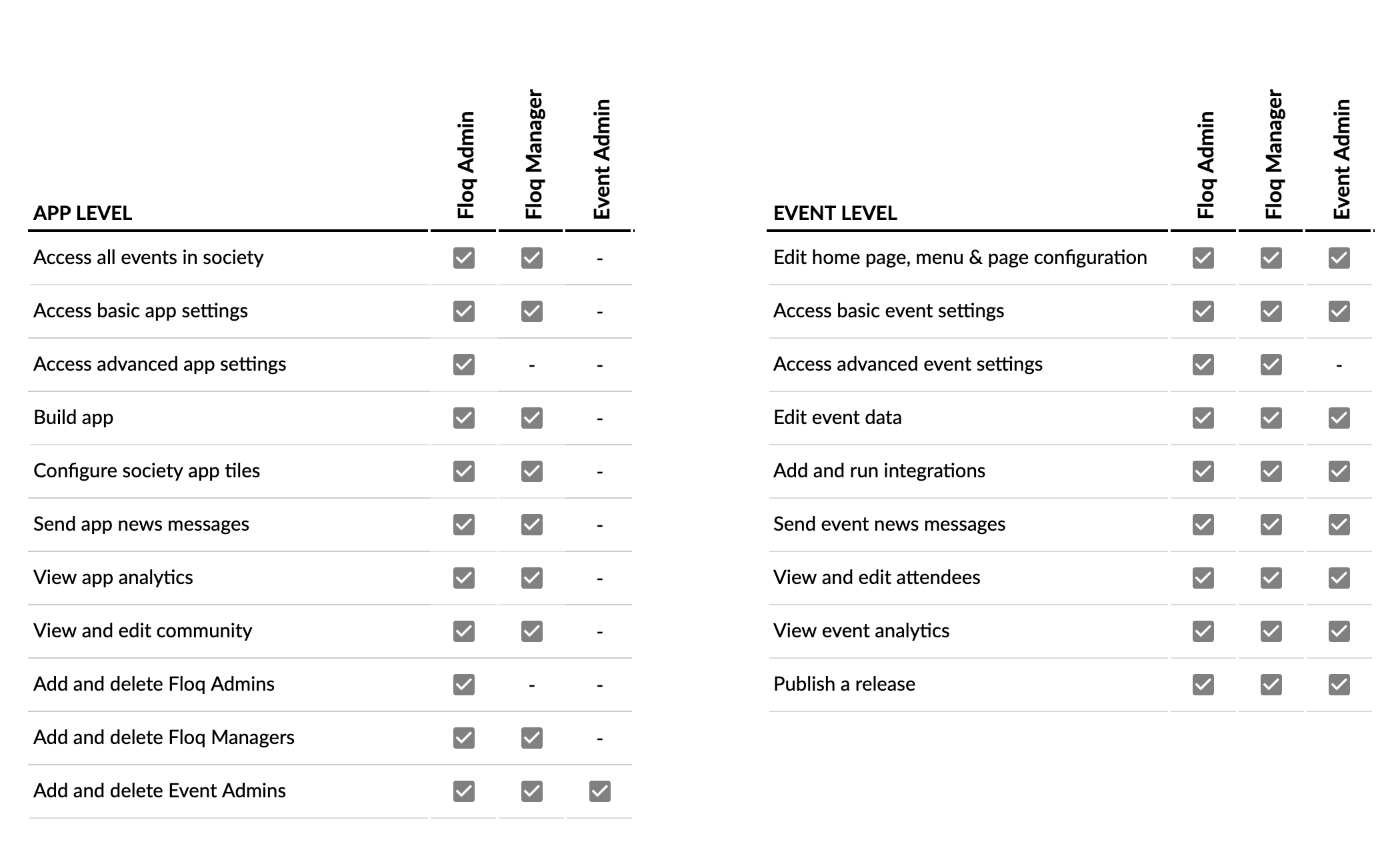 There are three different roles for a team member: Floq Admin, Floq Manager or Event Admin. The rights of these different roles are described in the table below.